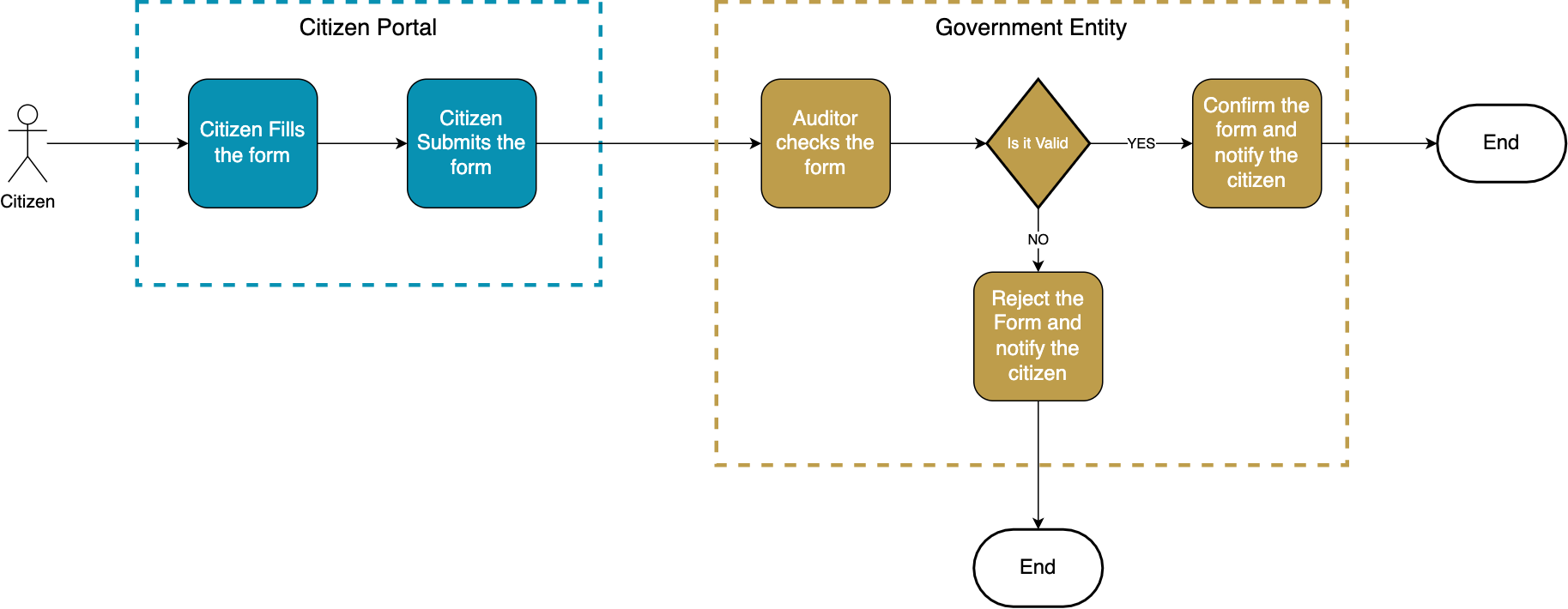 If there are multiple stages for the workflow or different entities involved. The workflow between the stages/entities should be separated by boxes and colors like the example below.
